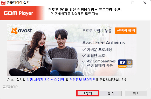⑤ 곰플레이어 설치가 아니라 Avast 안티바이러스 프로그램 설치를 유도하므로 필요 없는 분은 비동의하시면 됩니다.