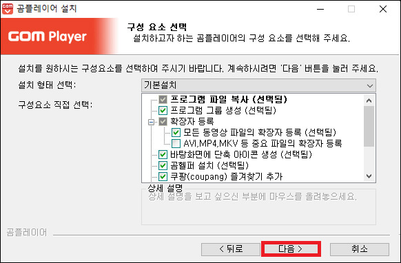④ 구성 요소를 선택해야 합니다. 다른 메뉴들은 상관없는데 쿠팡 즐겨찾기 추가 옵션도 숨어있으니 필요 없는 분은 선택을 해제하고 다음으로 진행하면 됩니다.
