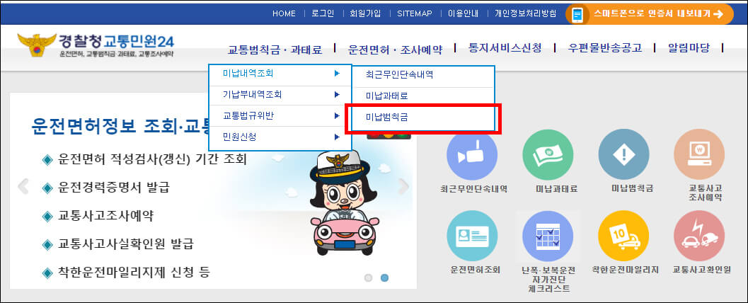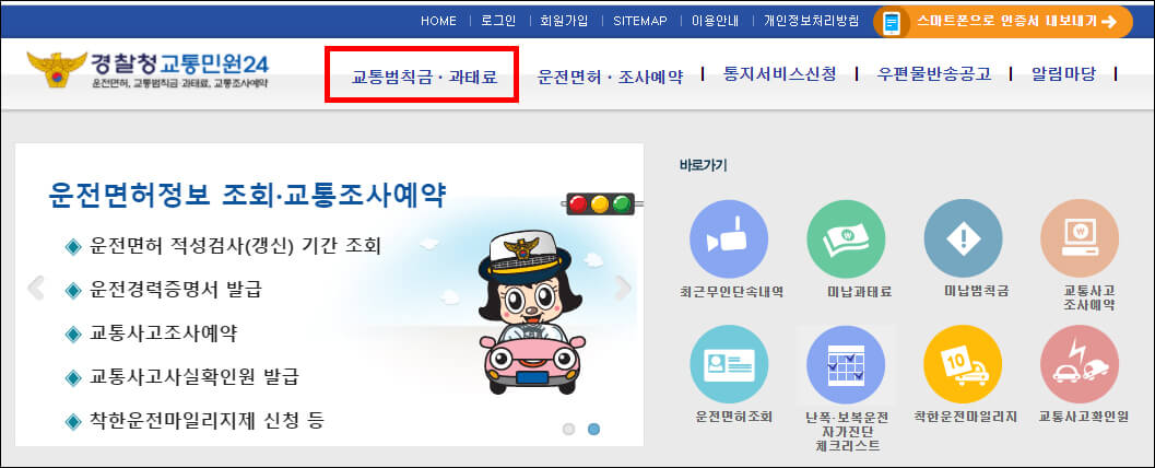 교통범칙금 조회는 홈페이지 상단에 있는 '교통범칙금·과태료' 메뉴를 선택하면 됩니다.