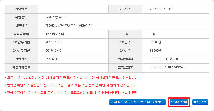 위반 장소를 클릭하면 상세 내용이 제공됩니다. 위반일시와 장소, 위반내역이 나오며 벌점이 부과 여부도 알 수 있습니다. 관할 경찰관서와 범칙금 번호도 표시되므로 통고서를 출력하고자 한다면 '통고서 출력' 버튼을 누르면 됩니다.