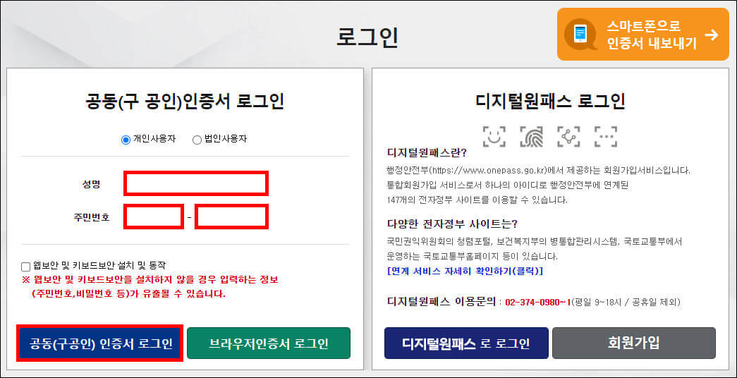 공동인증서나 디지털원패스가 컴퓨터에 설치되어 있어야 로그인이 가능합니다. 아직 인증방법이 없다면 먼저 설치하시기 바랍니다. 저는 이름과 주민번호를 입력하고 공동인증서로 로그인했습니다.
