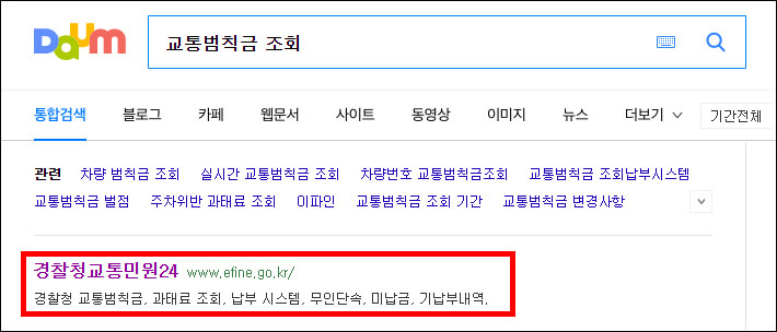 다음 등 포털 사이트에서 '경찰청 교통민원24'를 검색하거나 '교통범칙금 조회'를 입력하면 해당 사이트가 나옵니다. 바로가기 링크는 다음과 같습니다. https://www.efine.go.kr/