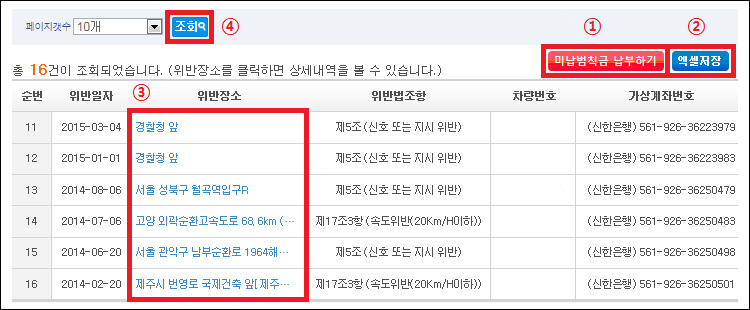 페이지 개수로 미납된 교통범칙금 내역을 조회할 수 있습니다.