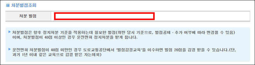 처분벌점 조회 화면이 나옵니다. 다행히 아직까지는 운전면허 벌점이 없어서 안심하고 운전을 할 수 있을 것 같습니다. 벌점이 20점을 넘은 분은 도로교통공단에서 벌점 감경 교육을 이수하면 1년 1회에 한해 벌점 20점을 감경받을 수 있다고 하니 참고하시기 바랍니다.