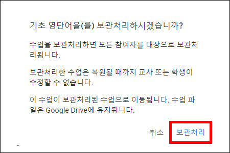 ③ 수업을 보관처리하겠냐는 알림이 뜹니다. '보관처리' 글자를 클릭하면 더 이상 수업은 진행되지 않습니다. 만약 학생들이 기존의 수업자료나 제출한 파일들을 다운로드하게 하려면 미리 기간을 공지해서 그전에 할 수 있게 시간을 주시는 게 좋습니다.