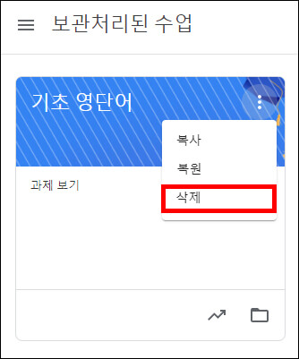 ② 보관처리된 수업은 상단 배너에 빗금이 쳐져 있어서 구별이 됩니다. 리스트가 나오면 예전 방법과 마찬가지로 점 세 개 아이콘을 선택합니다. 복사, 복원, 삭제 메뉴가 나오는데 이때 마지막 삭제 버튼을 누릅니다.