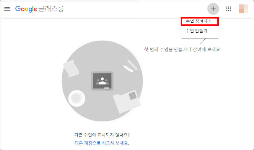 ② 우측 상단의 + 버튼을 선택해 '수업 참여하기'를 클릭합니다.