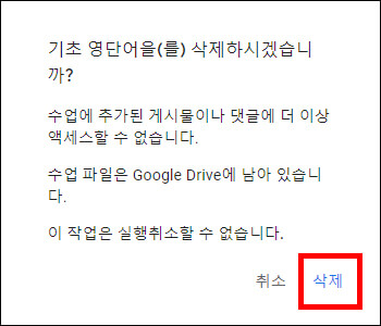 ③ 알림 창이 뜨면 삭제 버튼을 누릅니다. 이제 완전히 해당 구글 클래스룸이 삭제되었습니다. 수업을 삭제해도 수업 파일은 구글 드라이브에 그대로 남아 있습니다.