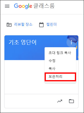② 보관처리를 원하는 수업 이름 오른쪽에 있는 점 세 개 아이콘을 클릭하면 보관처리 메뉴가 나옵니다.