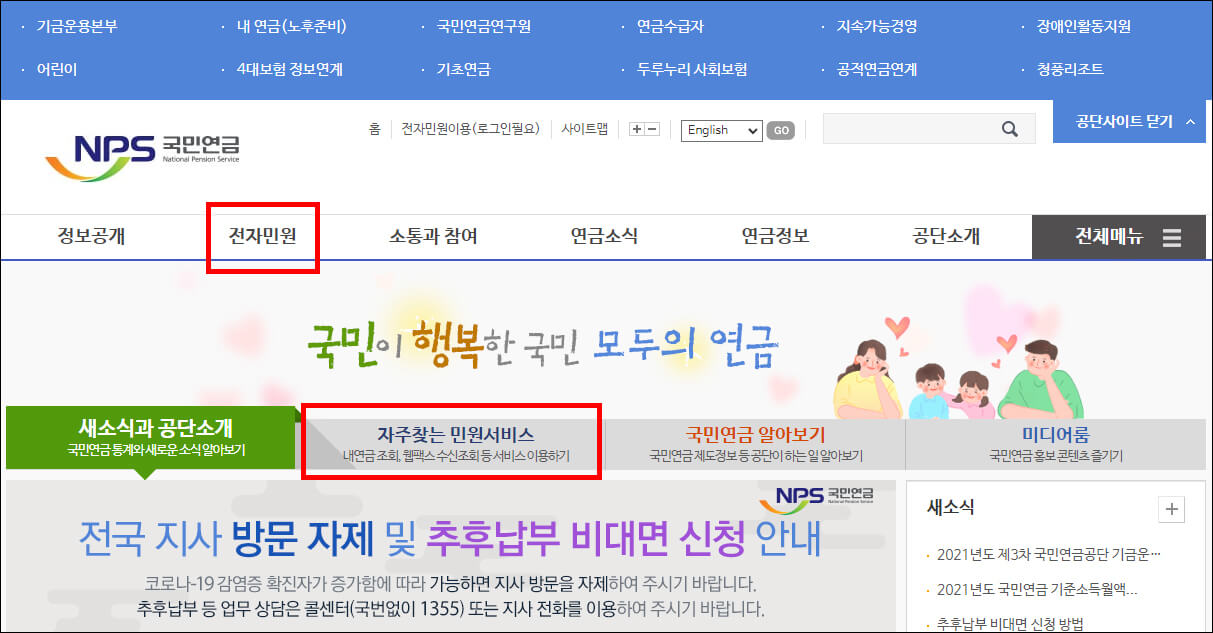 ① 홈페이지에서 국민연금 납부내역 조회 방법은 2가지가 있습니다. 첫 번째는 상단에 있는 전자민원 메뉴를 선택해 '개인민원' 메뉴를 클릭하면 됩니다.