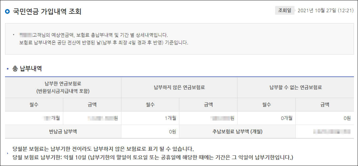 하단에는 자신이 지금까지 납부했던 국민연금의 총금액을 확인할 수 있습니다. 납부개월과 금액이 나옵니다. 추납보험료 납부액도 표시됩니다.