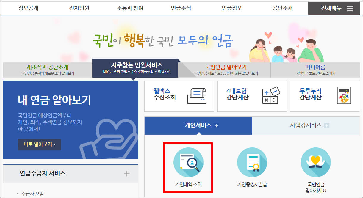 두 번째는 홈페이지 중간에 있는 메뉴 중 '자주 찾는 민원서비스'를 클릭합니다. 개인 서비스 메뉴 처음에 나오는 '가입내역 조회'를 선택하면 국민연금 납부내역 조회가 가능합니다. 저는 두 번째 방법으로 진행해 보겠습니다.
