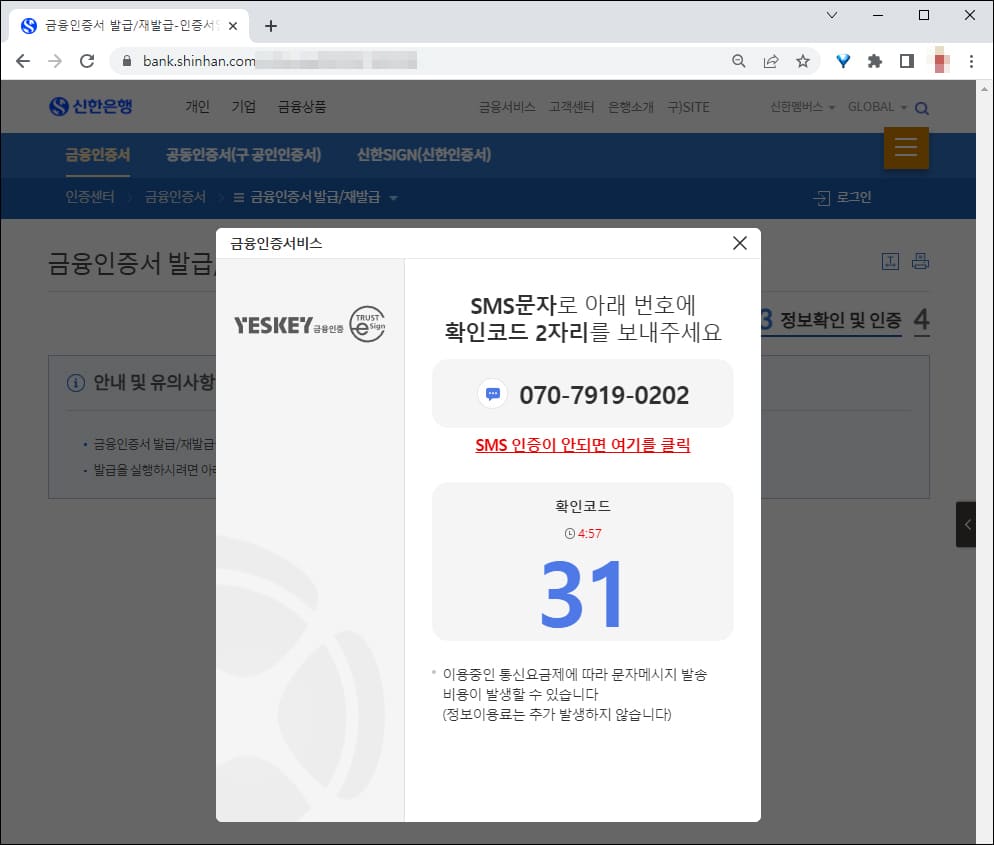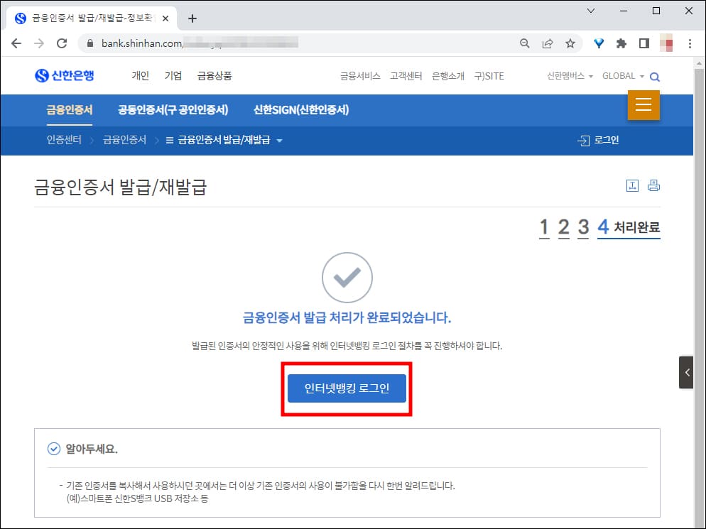 신한은행에서 금융인증서 발급받는 과정은 총 4단계입니다.