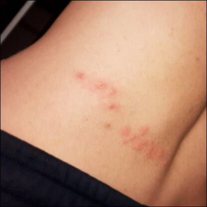 위의 사진과 같이 몸 한쪽 부분에 물집이 생기고 붉은 발진이 띠 모양으로 발생한다면 대상포진을 의심하고 바로 병원에 가시기 바랍니다.