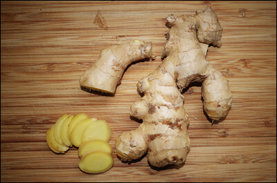 ② 생강 한 조각을 0.5mm 두께로 자릅니다. 빠르게 만들고 싶다면 잘게 다지거나 채를 썰어도 됩니다.
