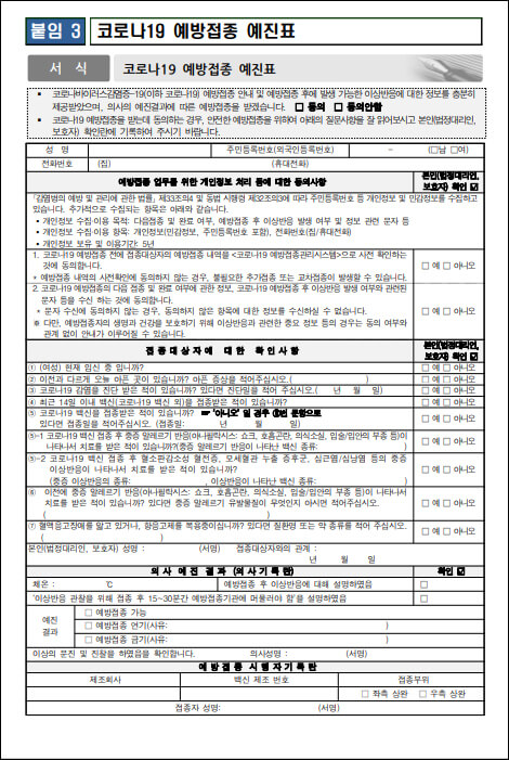 * 두 서류는 반드시 보호자(법정대리인)이 작성해야 하며, 해당 서식은 '질병관리청 코로나19 예방접종 누리집 > 알림·서식 > 지침'에서 다운로드 할 수 있습니다.