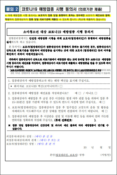 - 보호자(법정대리인)의 접종동의서
