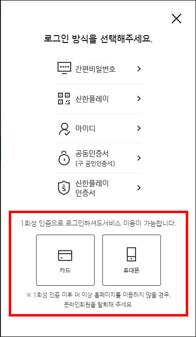 아이디가 없는 경우 1회성 인증으로 로그인하시면 됩니다. 저는 신한은행 체크카드를 사용 중이어서 1회성 인증으로 진행했습니다.
