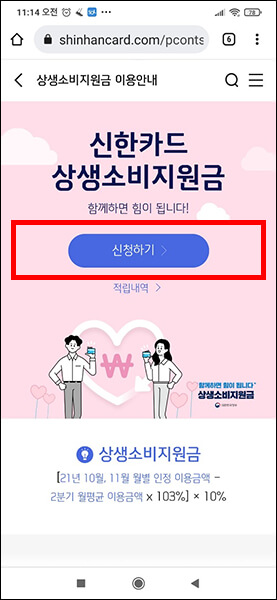 ② 상생 소비지원금 신청하기와 적립내역 확인 메뉴 2개가 나옵니다.