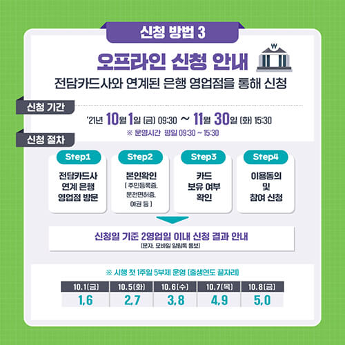 신한카드를 전담카드사로 선정하려는 분은 신한은행 영업점에 신분증(주민등록증, 운전면허증, 여권) 지참하고 직접 방문해서 신한카드 상생 소비지원금 신청을 할 수 있습니다. 평일 09:30~15:30까지 신청할 수 있으며 토요일, 일요일, 공휴일은 제외됩니다.