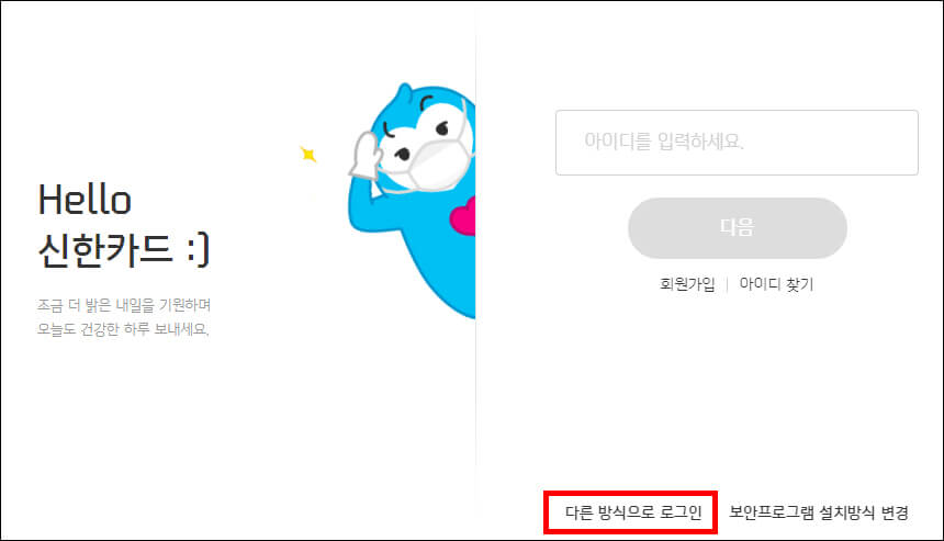 ③ 로그인 화면이 나옵니다. 신한카드 아이디가 없는 경우 하단의 '다른 방식으로 로그인'을 선택합니다.