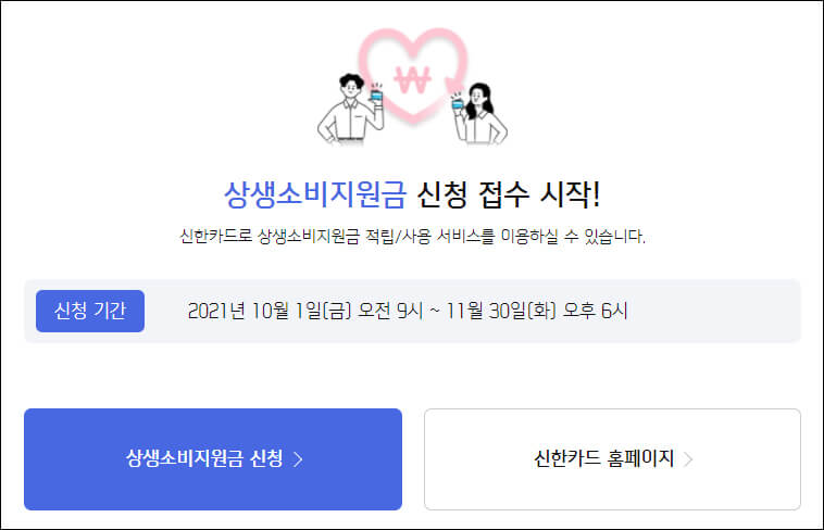 상생소비지원금 신청 접수 시작! 신한카드로 상생소비지원금 적립/사용 서비스를 이용하실 수 있습니다. 신청 기간 2021년 10월 1일(금) 오전 9시 ~ 11월 30일(화) 오후 6시