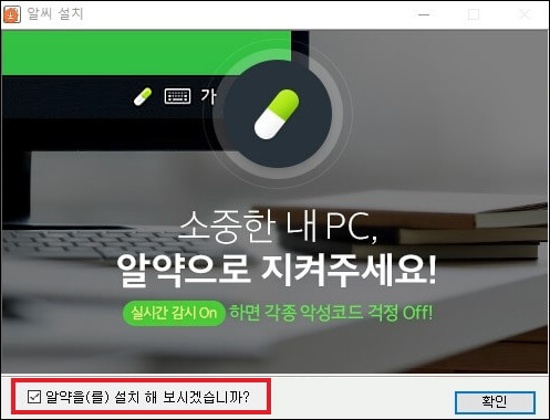 ⑦ 알씨가 설치되면 알툴즈 프로그램 중 알약 설치를 권하는 화면이 나옵니다. 설치할 생각이 없다면 선택을 해제하고 확인 버튼을 누르면 됩니다. 이제 알씨 다운로드 및 설치가 완료되었습니다.