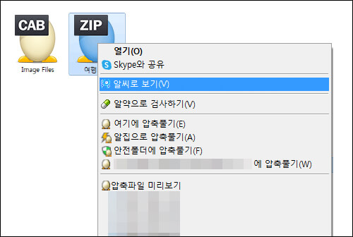 또한 압축된 이미지 파일을 번거롭게 압축 해제하지 않아도 알씨에서 바로 볼 수 있습니다. 이 경우에는 따로 알씨 프로그램을 실행하지 않아도 탐색기에서 압축파일을 선택하고 오른쪽 마우스를 클릭해 '알씨로 보기' 기능을 이용하면 바로 사용 가능합니다.