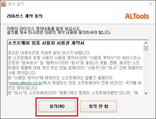 ③ 라이선스 계약 통의에서 '동의' 버튼을 누릅니다.