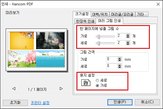 한 장의 용지에 여러 이미지 파일을 인쇄하는 것도 가능합니다. 같이 인쇄하고 싶은 이미지들을 선택한 후 '인쇄하기'를 누르면 '여러 그림 인쇄' 기능을 이용할 수 있습니다.