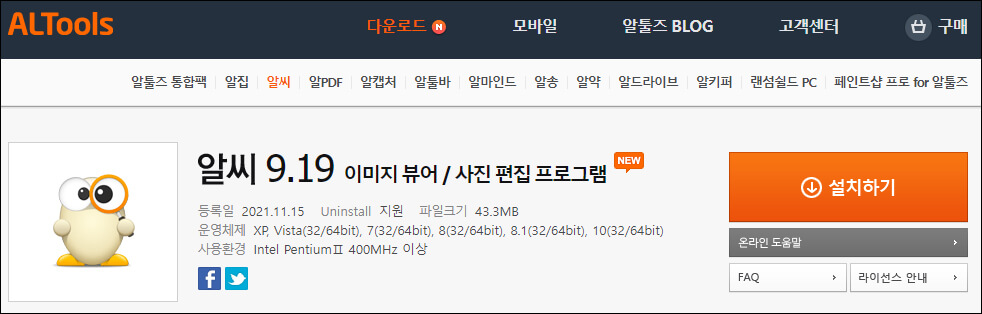 ① 알툴즈 다운로드 사이트에서 현재 제공되는 알씨 버전은 9.19입니다. 오른쪽의 '설치하기' 버튼을 누릅니다.