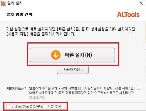 ⑤ 빠른 설치와 사용자 지정 중 선택할 수 있습니다. 저는 빠른 설치를 선택했습니다. 하단의 제휴 서비스는 사용하지 않는다면 선택 해제를 하시기 바랍니다.