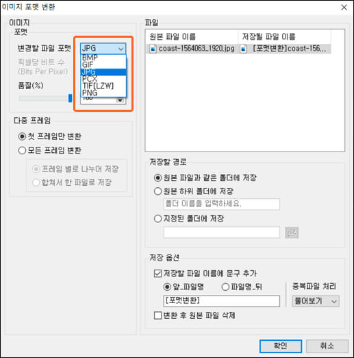 사용해야 하는 이미지의 포맷 방식이 여러 가지라서 통일하고 싶다면 알씨에서 변환할 수 있습니다. BMP, GIF, JPG, JPEG, TIF, TIFF, PCX, PNG 등으로 변경이 가능합니다. 가급적이면 편집한 파일은 따로 저장해서 원본을 보관해 놓은 것이 좋습니다.