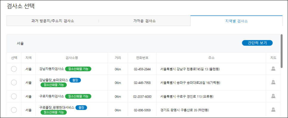 ⑥ 예전에 검사를 받은 곳이 있다면 해당 검사소 정보가 나옵니다. 저는 이번에 지역별 검사소를 선택했습니다.