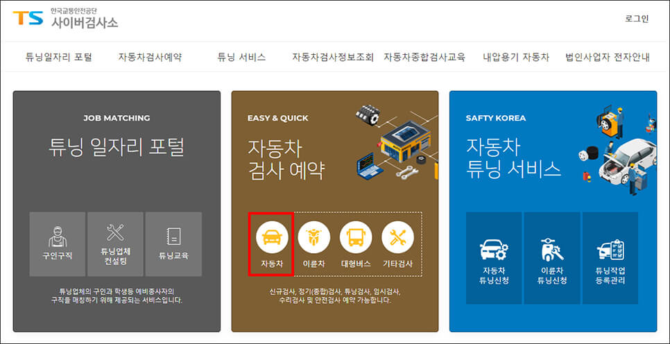 튜닝 일자리 포털 튜닝 일자리 포털 바로가기 --> 튜닝업체의 구인과 학생등 예비종사자의 구직을 매칭하기 위해 제공되는 서비스입니다. 자동차 검사 예약 자동차검사 예약 신규검사, 정기(종
