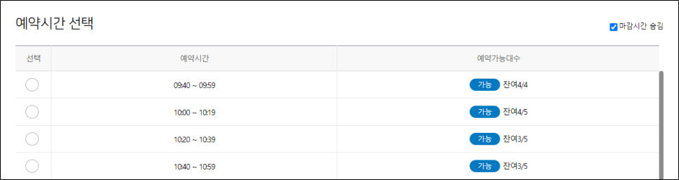 예약 가능으로 뜨는 시간을 선택하면 됩니다.