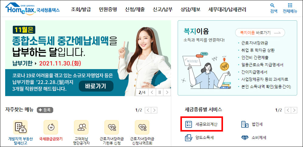 국세청 홈택스 홈페이지에 방문해 세금종류별 서비스 메뉴의 '세금모의계산'을 선택합니다.