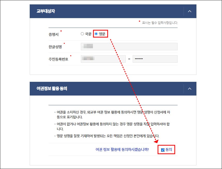 해외에 제출할 계획이라면 영문으로 선택을 바꾸어 줍니다. 하단에 여권정보 활용 동의란이 새롭게 생깁니다. 여권정보 활용에 동의합니다. 여권이 있으면 영문명은 여권과 동일하게 명시되며, 여권이 없거나 동의하지 않으면 직접 여권명을 입력합니다.