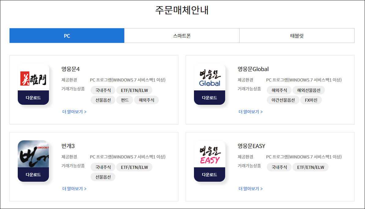HTS 프로그램은 키움증권 홈페이지 다운로드 메뉴에서 확인할 수 있습니다. PC, 스마트폰, 태블릿 버전으로 나와 있습니다. 저는 초보자들이 쓰기 좋다는 영웅문4를 설치해서 사용 중입니다.
