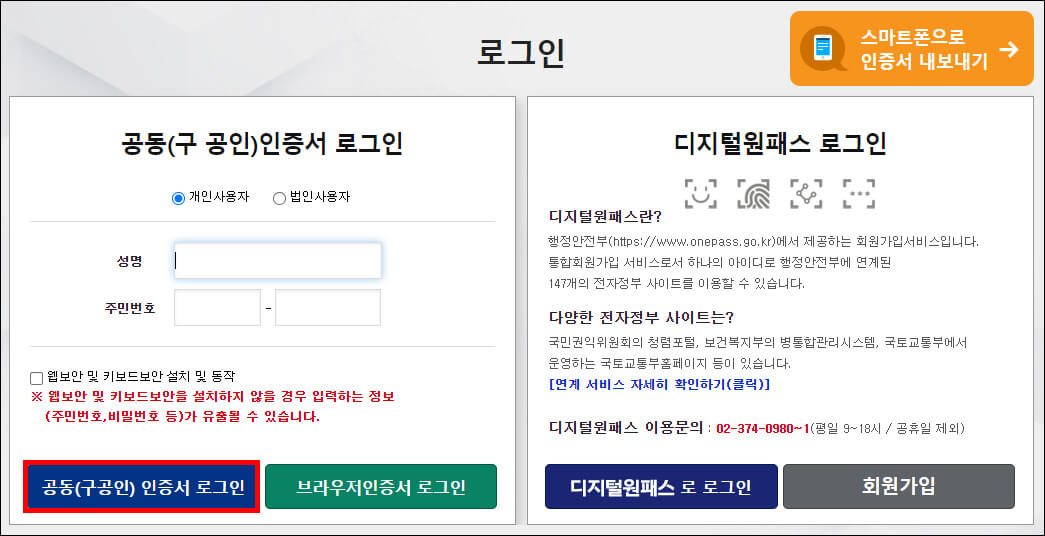 홈페이지, 모바일 앱 모두 공동인증서와 디지털원패스로만 로그인이 가능합니다. 따로 회원가입을 하지 않아도 인증만 하면 모든 메뉴를 사용할 수 있습니다. 처음 이용하는 경우에는 보안 프로그램도 설치해야 합니다.