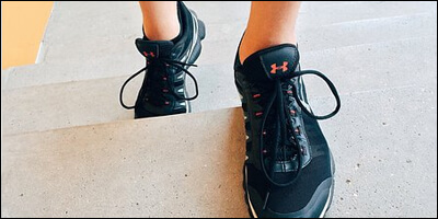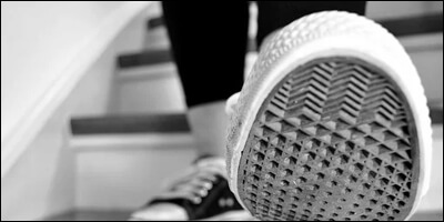 계단에 발을 디딜 때는 11자로 발 모양을 유지합니다. 발이 안이나 밖으로 휘면 계단을 오르다가 발이 꼬여 넘어질 수 있습니다. 종아리 근육에 자극을 주려면 발바닥의 절반만 계단 위에 올리는 것이 좋습니다. 이 자세는 무릎관절의 손상을 방지하고 허벅지 앞쪽 근육까지 동시에 쓸 수 있는 장점이 있지만 발바닥 통증이 있는 경우에는 추천하지 않습니다.