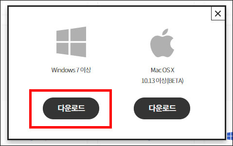 윈도 7 이상 버전과 맥 OS X 버전 2가지로 나오니 일반 PC를 사용하는 분은 왼쪽을 선택하면 됩니다.