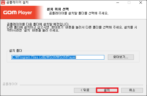 ⑦ 드디어 곰플레이어 설치 위치 선택이 나옵니다. 따로 설치 폴더를 변경할 필요 없이 그대로 진행하면 됩니다.