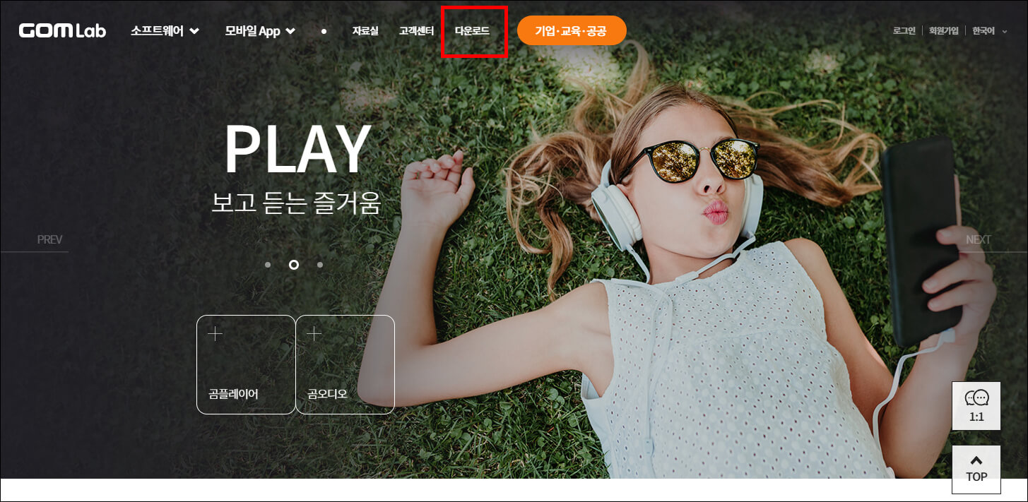 ① 포털에서 곰플레이어 다운로드를 검색하면 공식 홈페이지로 접속이 되는데 영문 버전이 먼저 나옵니다. 우측 상단의 언어를 바꿔서 이용하시면 됩니다.