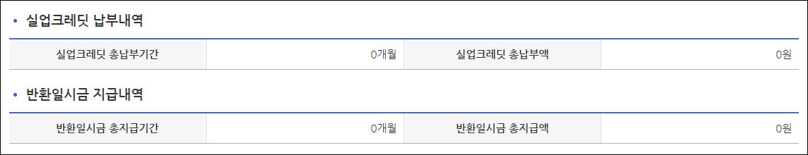 실업 크레딧 납부내역과 반환일시금 지급내역이 나옵니다. 저는 신청한 적이 없어서 0원으로 표시되어 있습니다.