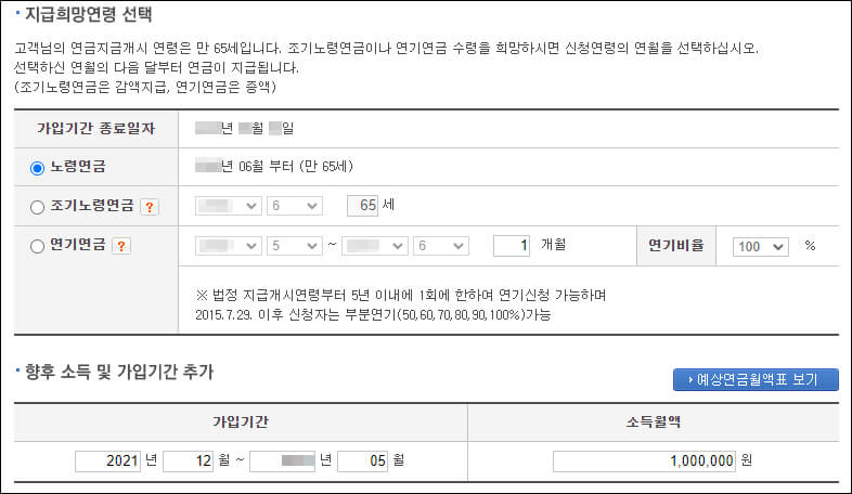 지급희망연령에 따라 국민연금 수령액은 달라집니다. 노령연금, 조기노령연금, 연기연금을 선택하면 되는데 저는 만 65세에 지급받는 노령연금을 선택했습니다.