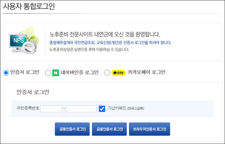 ③ 사용자 통합로그인 화면이 나옵니다. 주민등록번호를 입력하고 공동인증서, 금융인증서, 브라우저인증서 3가지 중 하나를 선택해 본인 인증을 진행합니다.