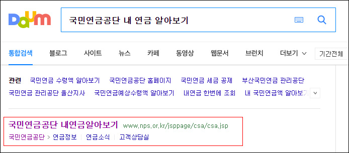 ① 다음 등 포털 사이트에서 '국민연금 내 연금 알아보기'를 입력하면 바로 국민연금 홈페이지의 해당 메뉴 링크를 확인할 수 있습니다. 해당 링크 주소는 다음과 같습니다. https://www.nps.or.kr/jsppage/csa/csa.jsp