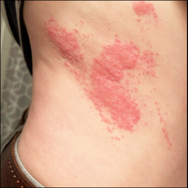 위의 사진과 같이 몸 한쪽 부분에 물집이 생기고 붉은 발진이 띠 모양으로 발생한다면 대상포진을 의심하고 바로 병원에 가시기 바랍니다.