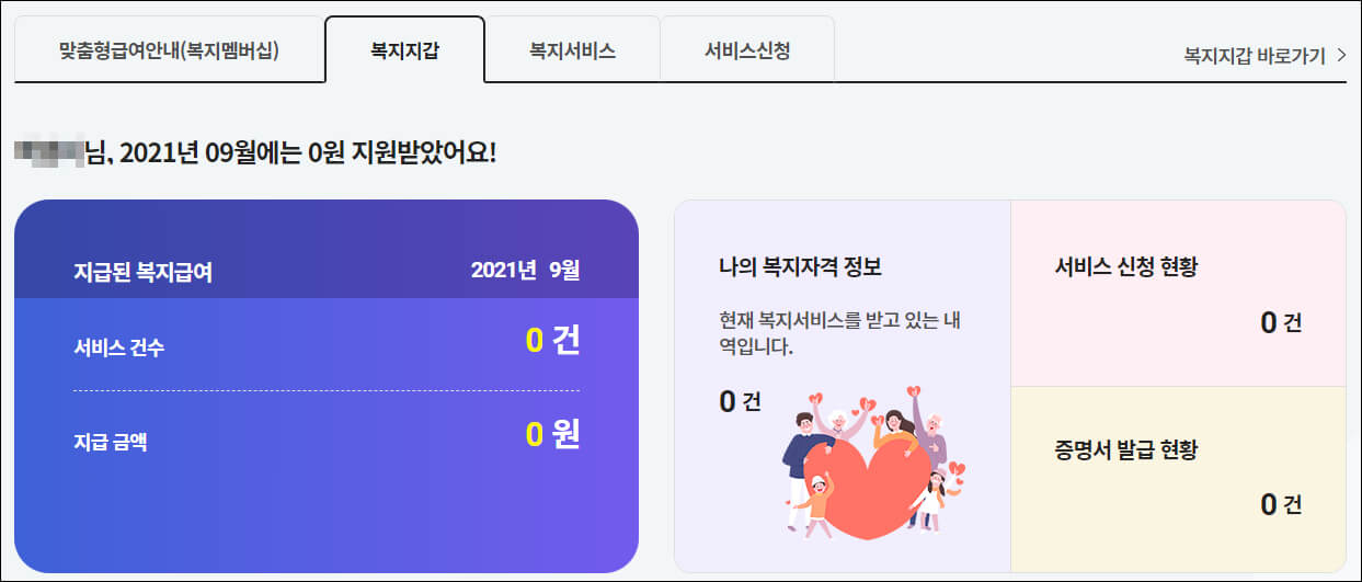공동인증서로 로그인을 하면 복지로 홈페이지 하단에서 본인의 정보를 확인할 수 있습니다. 제 공동인증서로 들어가보니 9월 지원 내역이 나옵니다.